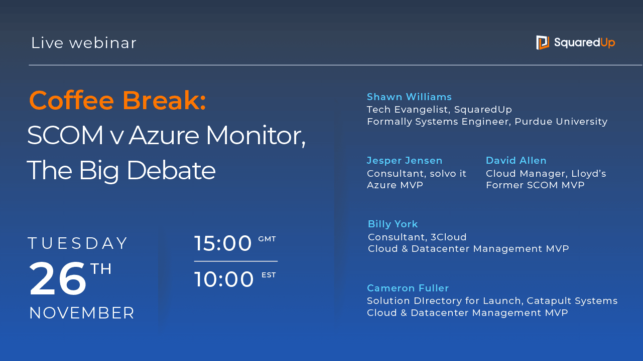 Experts include Cameron Fuller (SCOM MVP), Billy York (SCOM and Azure Monitor MVP), Jesper Jensen (Azure MVP and consultant), and David Allen (Cloud Manager at Lloyds of London), and the session is hosted by our very own Shawn Williams, SquaredUp Tech Evangelist and former Purdue University Systems Engineer. Scroll down for their full job titles and social media handles, plus a list of all the questions covered and their corresponding timestamps.