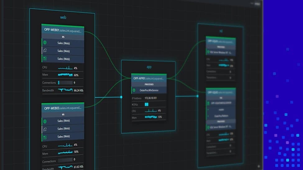 With this dynamic tool, you can immediately see the servers, their services, who is talking to who, and the port they’re using. And since the links are monitored, when they fail, they turn red, helping you quickly pinpoint the source of the issue.